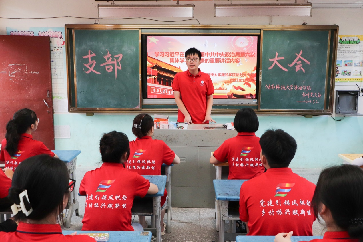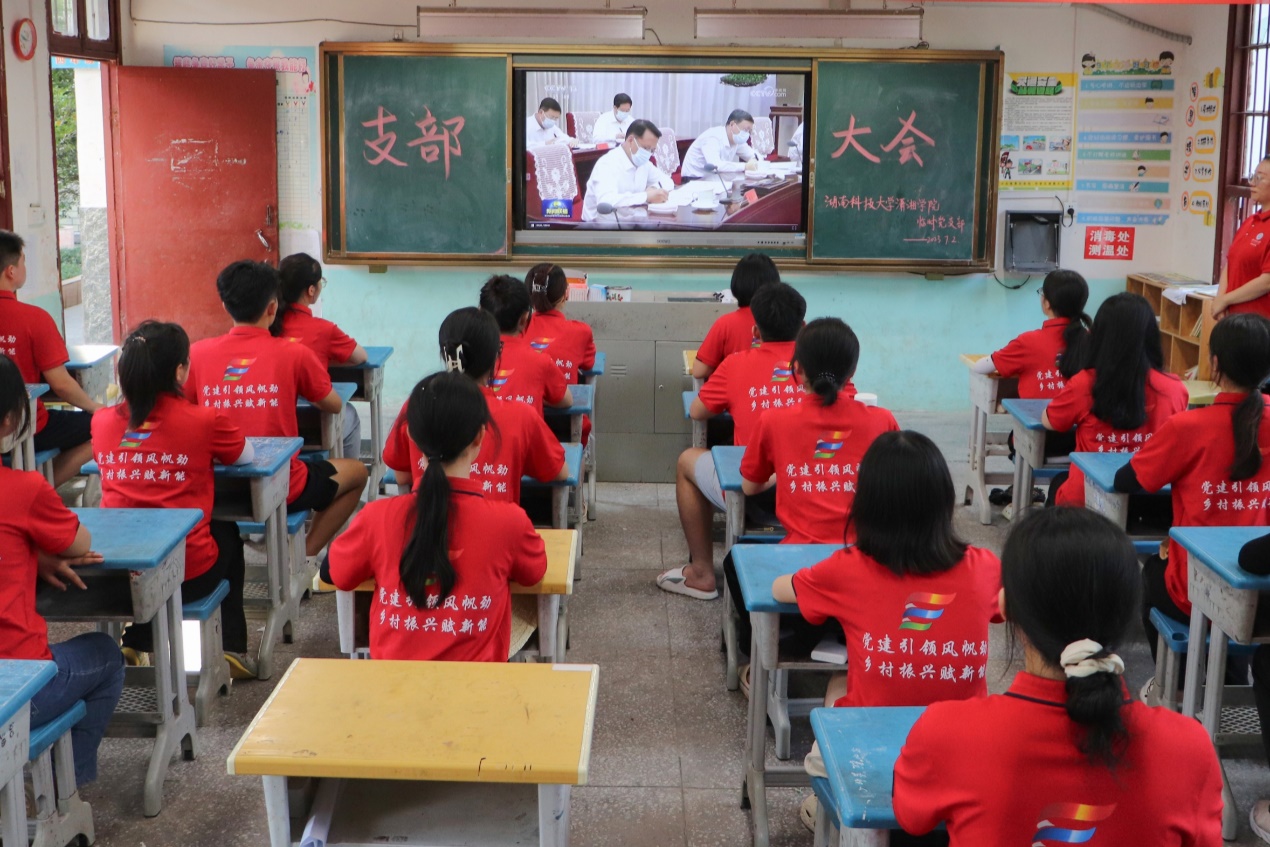 为深入学习贯彻习近平新时代中国特色社会主义思想,充分发挥党组织战斗堡垒和党员先锋模范作用,努力将学院学生培养成为担当民族复兴大任的时代新人,7月2日下午,beat365官网于湖南省怀化市通道县木脚完全小学观看习近平在第二十届中共中央政治局第六次集体学习重要讲话内容视频。学院暑期“三下乡”实践团临时党支部全体成员共同观看。