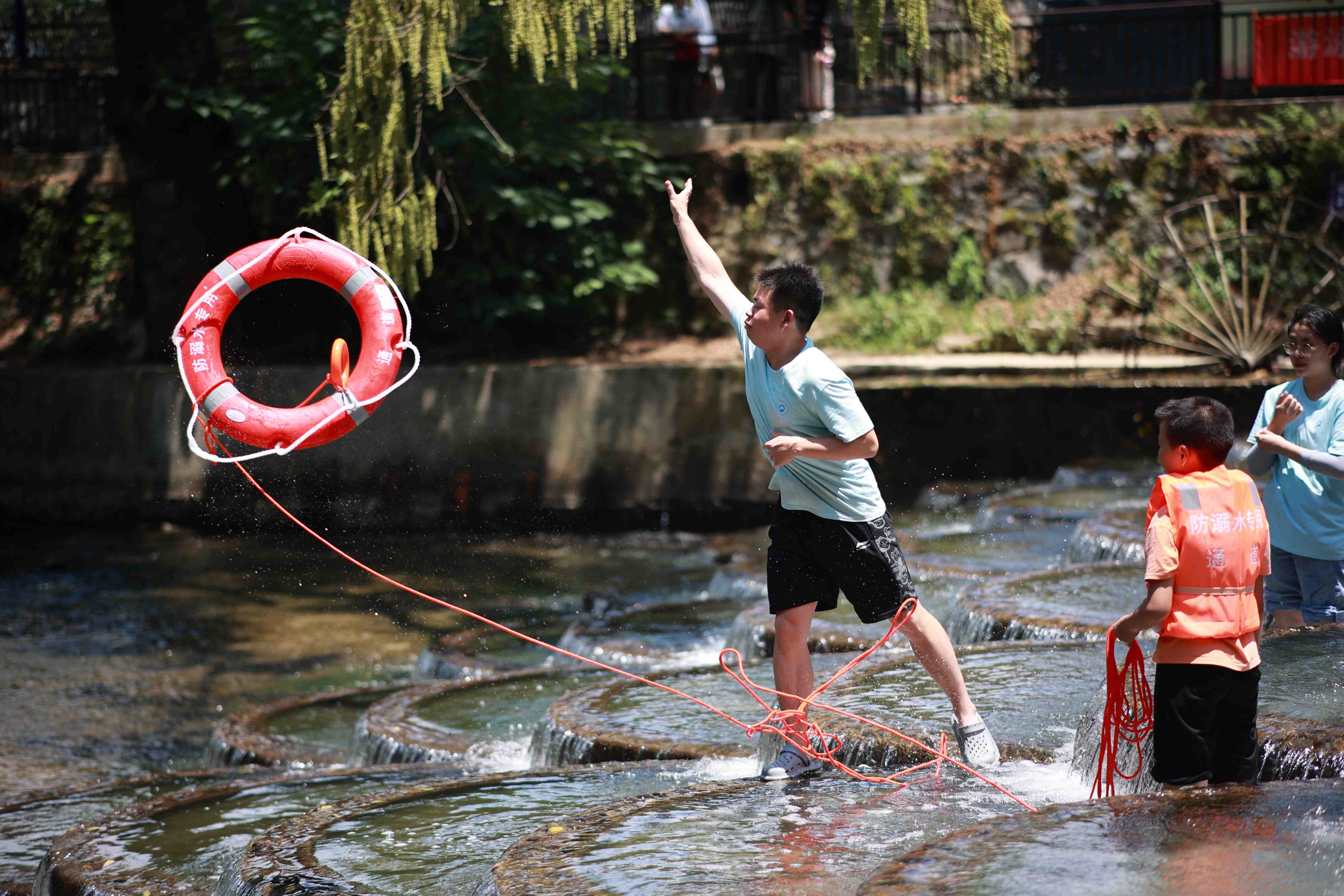 跨步、抛掷等一系列行云流水的动作,曾创来向孩子们展示救生圈的正确使用方法,手把手教孩子们如何正确佩戴救生衣。他提醒道:“使用救生圈时,应把救生圈抛在落水人员的下流方向。”随后,他向孩子们科普溺水时的系列自救措施,如保持冷静不乱动,眼睛尽量保持撑开的状态,屏住气去除重物;采取头向后仰头,口鼻露出水面,呼气浅吸气等。