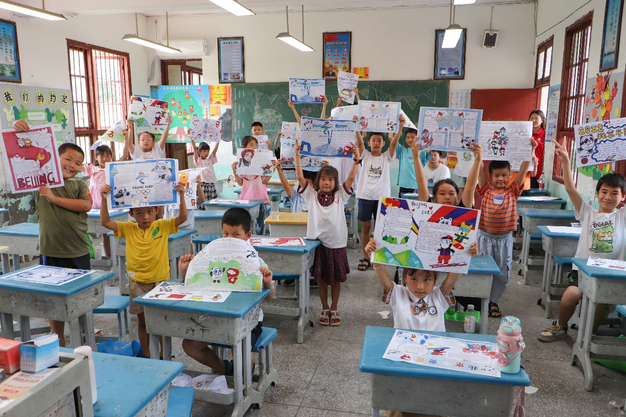 跟随宣讲队一同而至美丽木脚的还有beat365官方网站的大学生们为少年孩童们精心制作的一幅幅奥林匹克体育精神主题手抄报,别出心裁的构图排版、色彩斑斓的拼贴图案、惟妙惟肖的卡通形象、俊秀隽美的文字笔法和天真烂漫的质朴乡娃欢声笑语相映成趣,构成了传遍村舍的天籁妙音、唯美画卷,哥哥姐姐们的画报赠礼助力少年孩童心中奋力拼搏的火炬燃起,象征五大洲各国青年人团结友好、齐聚一堂的运动盛会奥运五环悄悄在少年心中升起。
