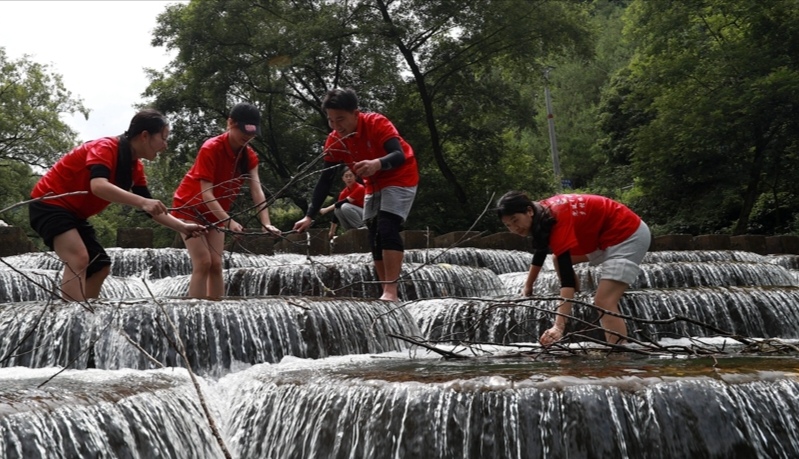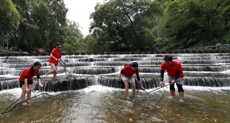 近年来,通道纵深推进“创建国家级旅游度假区”建设,木脚村借助得天独厚的和谐秀美自然山水,坚持生态优先、绿色发展同时大力发展旅游业。徐风伴随树林沙沙,清澈的河水潺潺流经当地鱼鳞坝景点,一级级水泥墩和木板铺设而成的台阶坝顶经一夜风雨后堆积着长条枯枝,实践团成员为协助乡村河道生态治理,改善其河道景观带外貌建设,亲自下水拾捡枯木。尽管汗水流经脸庞,河水沾湿了裤腿,实践团成员依然共力于坝体上的每块“鱼鳞”,不言劳苦,只为吸引游人爱于此亲水纳凉,为当地百姓谋福祉,增幸福。盛夏的水流于“鱼鳞”中溢出,形成的错落有致弧形瀑布和林荫绿树交织起青年学子的梦。