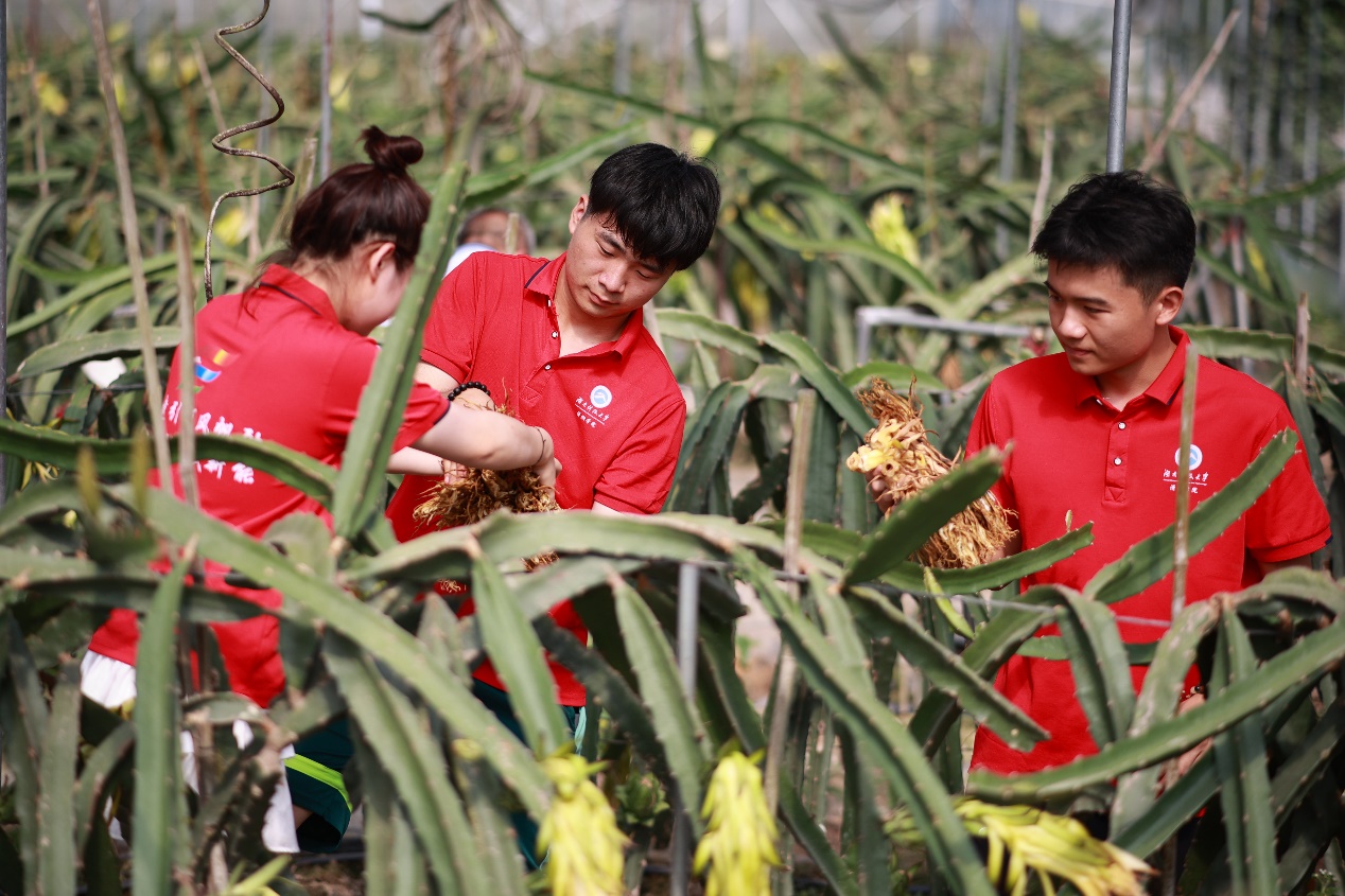 火龙果种植业作为木脚村特色农业发展的重点备受外界关注,为保植株健康生长,促进其高产高质开花结果,实践团成员晨曦乍现时便一同行至木脚村火龙果种植基地,在果农指导下身体力行,协助梳理未成熟火龙果枯萎残花。他们保持轻柔操作,在把受损枯败的残花妥善剪除,对长势较差、有病虫害的枝条也进行了适量修剪后又收集整理好剪下的残花和枝条,以防止其堆积在地面或盆土中而引发病虫害。烈日高照,面对铁桶里已装得满满当当的残花败絮,实践团成员身汗涔涔但笑连连,剪枝采花工作就此圆满完成。他们回程时把歌欢唱,期许当地火龙果地喜迎丰收,果子畅销无阻。
