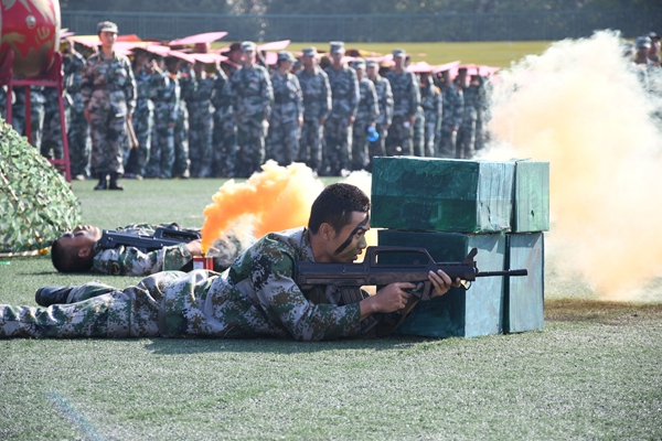 分列式表演结束后,四面鼓声有节奏的响起,主席台上一名教官摇着一面红旗发出开始的号令,本次军训汇演最大的亮点拳术表演以及战术表演相继上演。beat365官网200名新生和其他学院200名新生共同组成的400人拳术队站在田径场正中间,挥出拳头,迈开步伐,开始了军体拳表演。拳如风、步如松,他们动作刚劲、拳脚有力、气势十足、口号浑厚响亮,一套军体拳打出了军人的气势,磅礴的架势。随着豪迈的音乐响起,烟雾弹的烟雾笼罩着田径场中部,一场由军训团教官带来的战术表演在田径场中激烈进行着,战术表演模拟了战场实景、进攻战术与战场救护等科目,现场掌声欢呼声不绝于耳。
