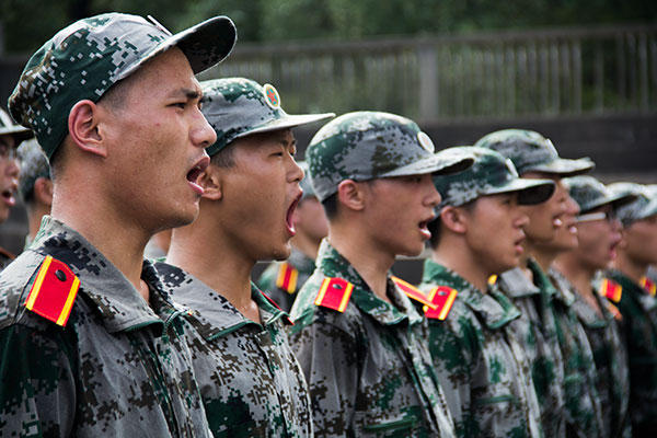 “脚跟靠拢并齐,两脚尖向外分开约60度;两脚挺直;小腹微收,自然挺胸;上体正直,微向前倾;两肩要平,稍向后张;两臂自然下垂,手指并拢自然微屈,拇指尖贴于食指的第二节,中指贴于裤缝;头要正,颈要直,口要闭,下颌微收,两眼向前平视。”二营五连41排的教官在下达军姿准备命令后,为了让新生检查军姿姿势是否执行到位,总会让自己的“兵”把要领背出来。