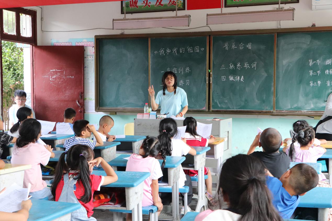 最后,到声乐部分时,志愿者肖琴,热情大方地为学生讲解简单的音乐常识并激情彭湃地进行示范,在带小朋友们开嗓、练习五音和节拍后,就正式进入《我和我的祖国》的学习,“我和我的祖国一刻也不能分割,无论我走到哪里,都流出一首赞歌......”嘹亮的歌声在教室里回响起来。