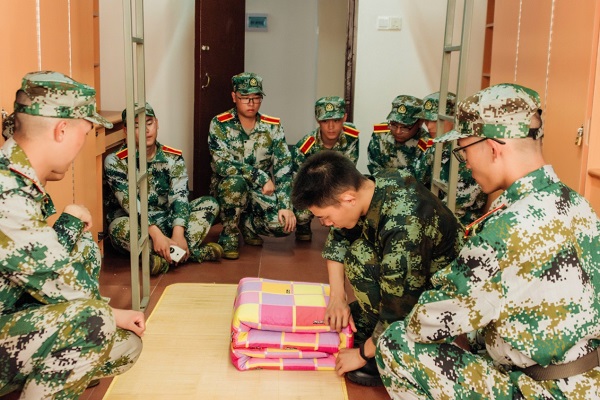 他严格按照部队内务的高标准把自己的宿舍打造成示范宿舍。同时,他亲自上阵,来到新生宿舍,向新生演示怎样叠出豆腐块。“叠被,要三折四叠。叠完被子后细心对被子的边边角角进行修整,这才能真正叠好军被。” 彭达边叠被子边向新生们解释道。