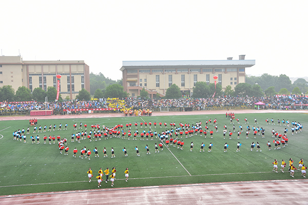 在运动员代表张俊东,裁判员代表唐宁潇宣誓后,精彩的文艺表演在同学们的欢呼声中如约而至。由近200名科大教职工组成的舞蹈队为全校师生带来了一场大型扇子舞表演《红烛》,拉开了本届运动会开幕式表演的火红序幕,演绎着如诗如画的美丽,他们伴随着悠扬的节奏挥舞着鲜红的红扇,她们的每种动作都在诠释着教师们的奉献精神,如同“红烛”般照亮他人,奉献自己,展现了科大教职工自信的风采。艺术学院的大型舞蹈节目《湘楚大地谱新章》那历经传承的湘潭油鼓,激起了我们撸起袖子加油干的热血;洁白的荷花,彰显出这一方山水的人文底蕴;金色的翅膀,绘就了科大学子在学海中展翅翱翔的风貌。商学院的团体操表演《希望》舞动青春、彰显活力,点燃了现场的气氛。体育学院的龙狮表演更是使现场气氛达到高潮,金龙将红狮围绕在中心为欢迎来宾之意,龙狮摆出爱心形状为爱我中华之意,五龙组成五环意为将奥运精神传承发扬,最后摆成“中,国,龙”三字则是预祝更好的发扬中国体育精神。